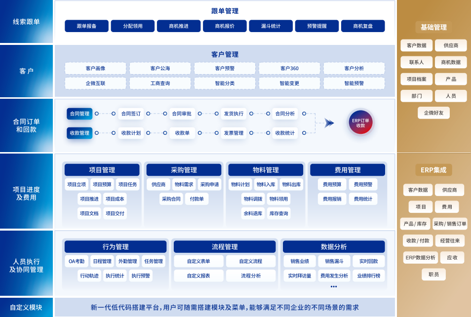 管家婆CRM能覆盖全流程、连接全生态,堪称企业管理的救星。搭建各类业务模块,深度集成国内主流ERP,实现以销定采、产销协同、业财一体;支持线下流程线上化,纸上能画的流程均可搬到线上,同时权限独立划分、千人千面,修改查看留痕,保障数据安全。