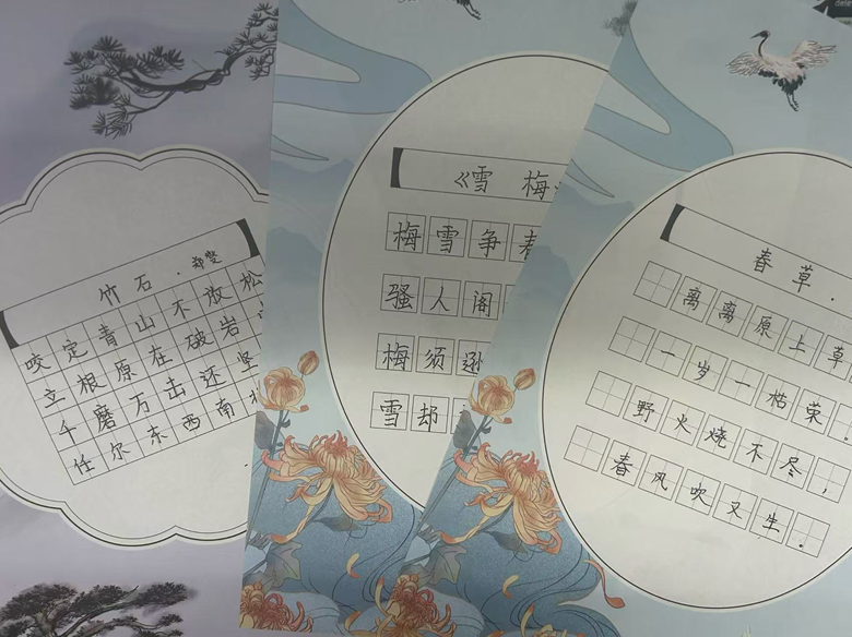 姐妹们执笔端坐,凝神书写。笔尖划过纸面,沙沙声轻响成韵。无人交语,各自沉浸于横竖撇捺之间。